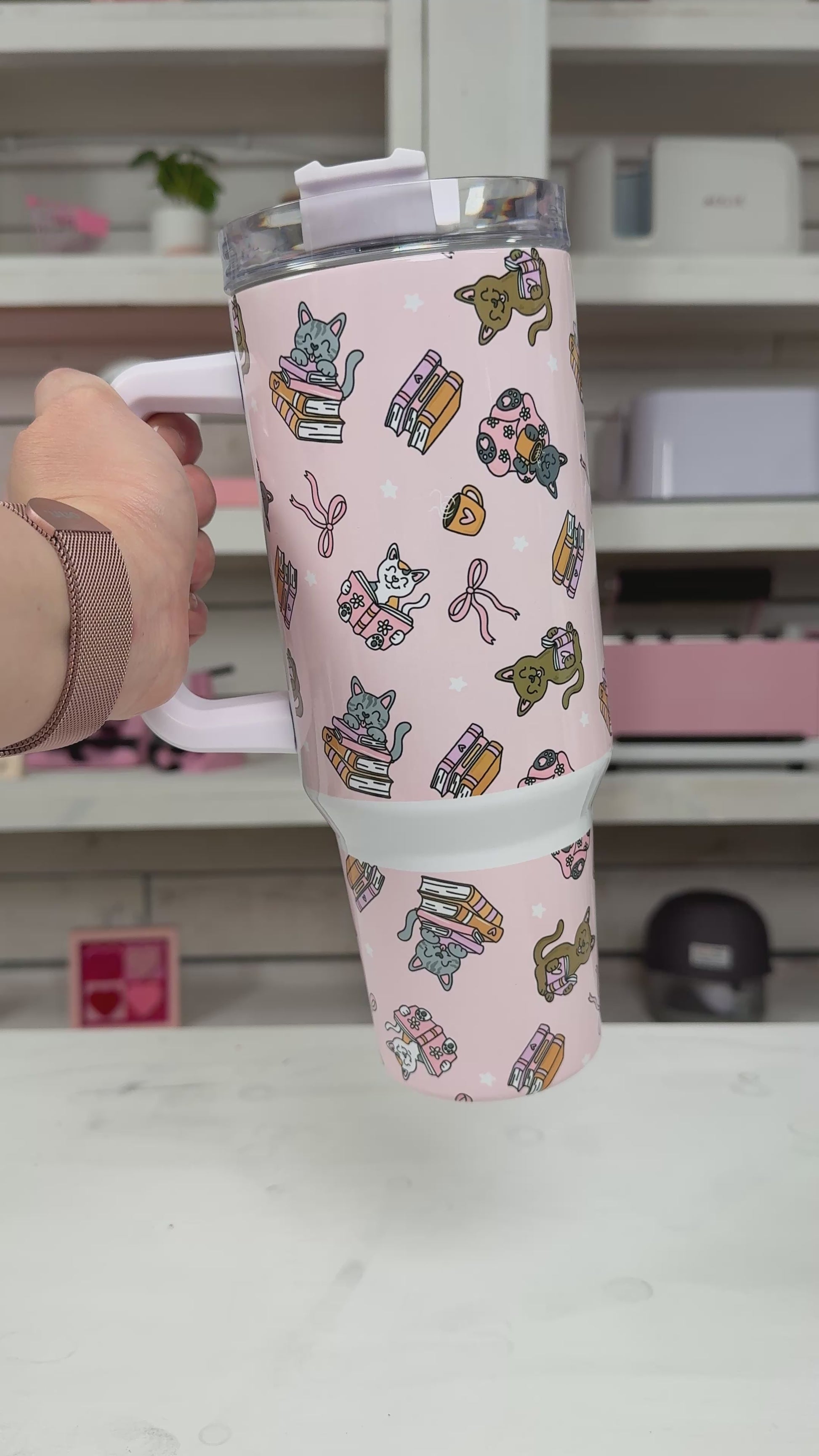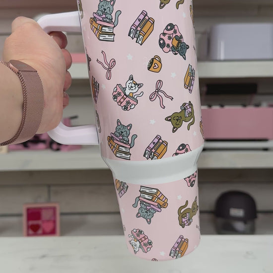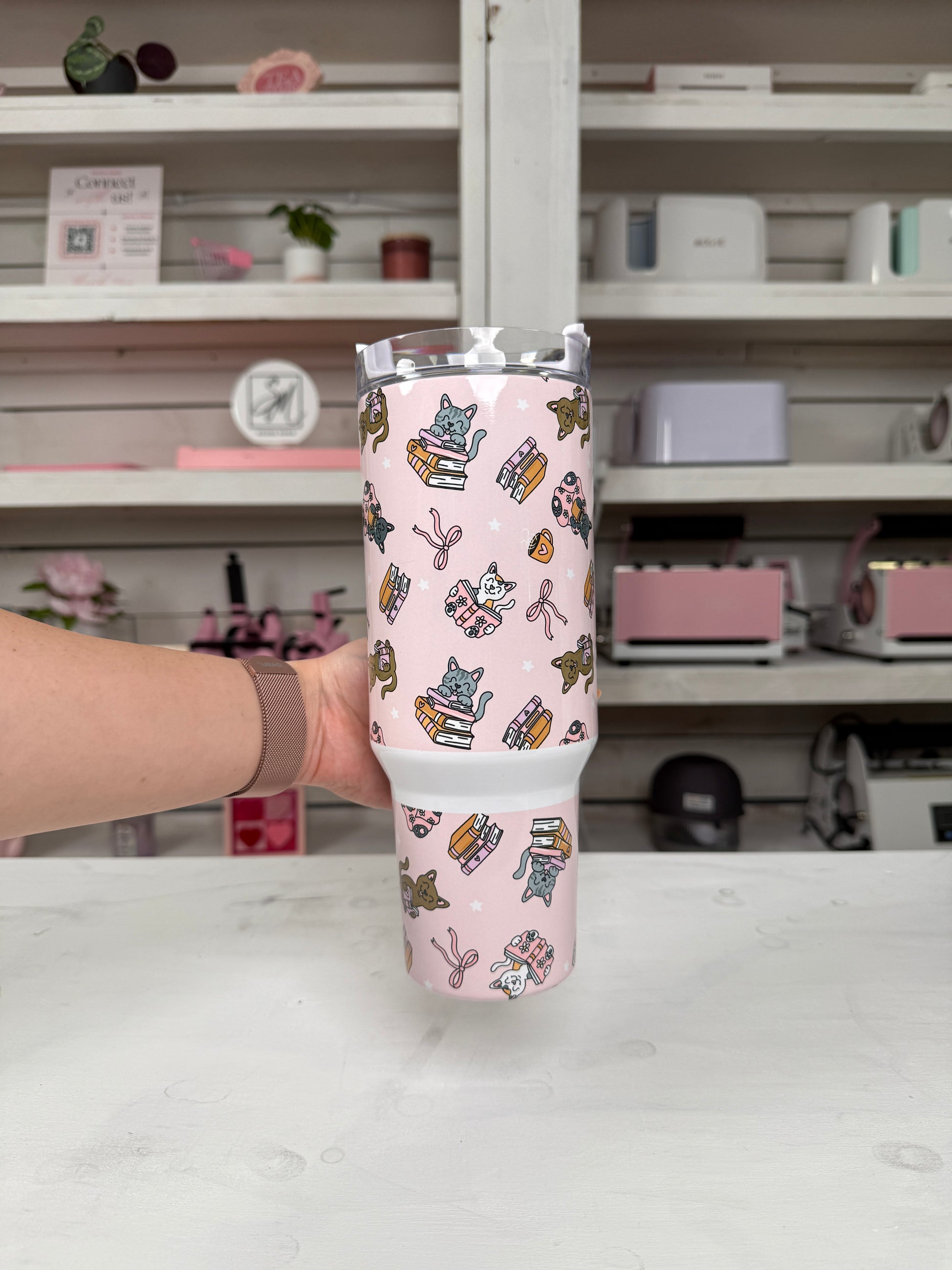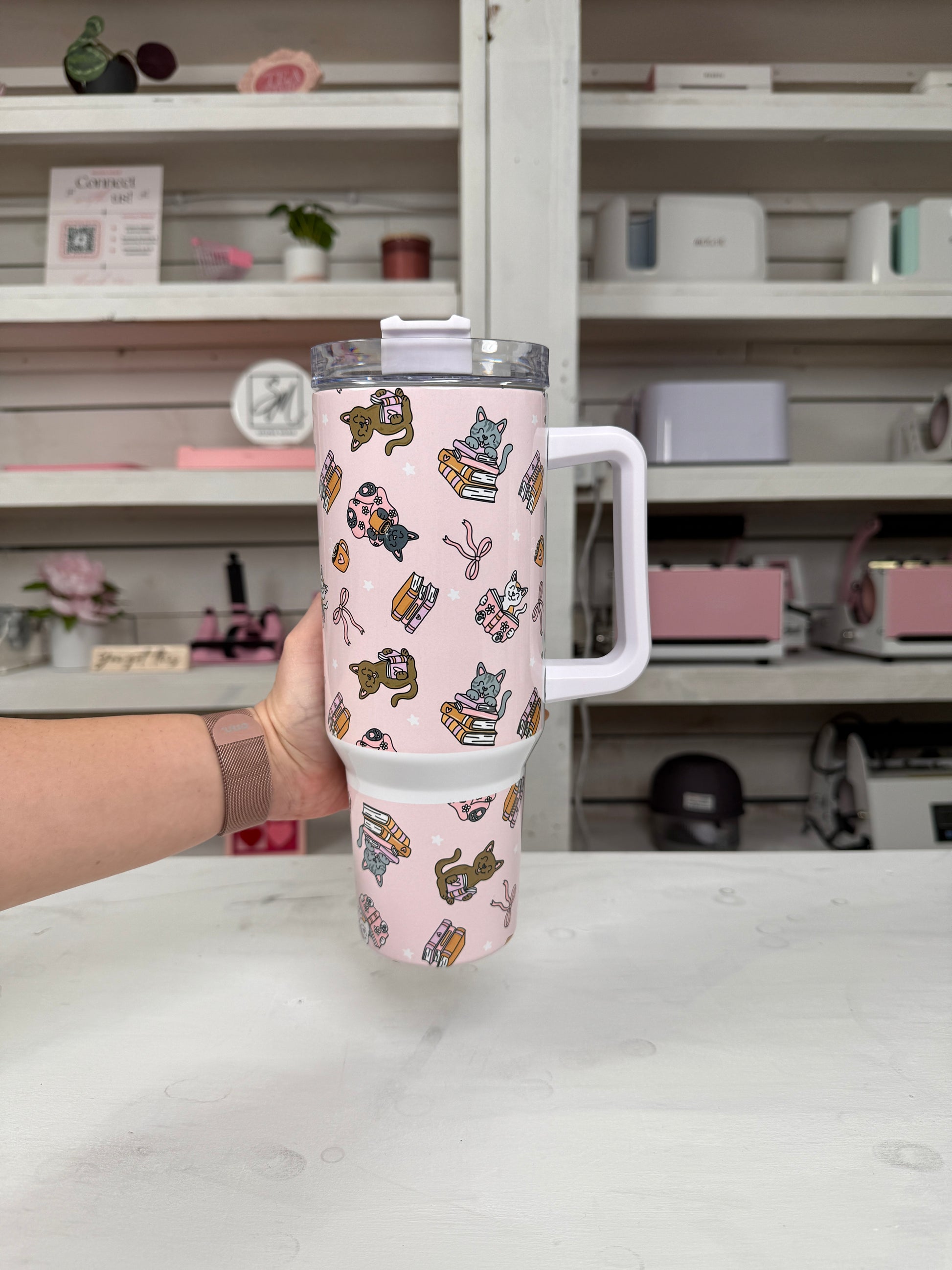 Cozy Bookish Cats 40oz tumbler, Cozy Book Vibes quencher, Books and Cats custom tumbler