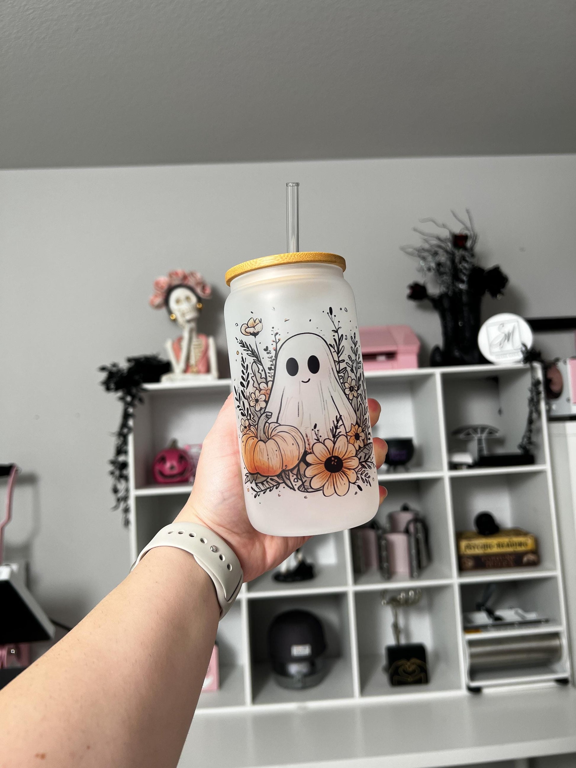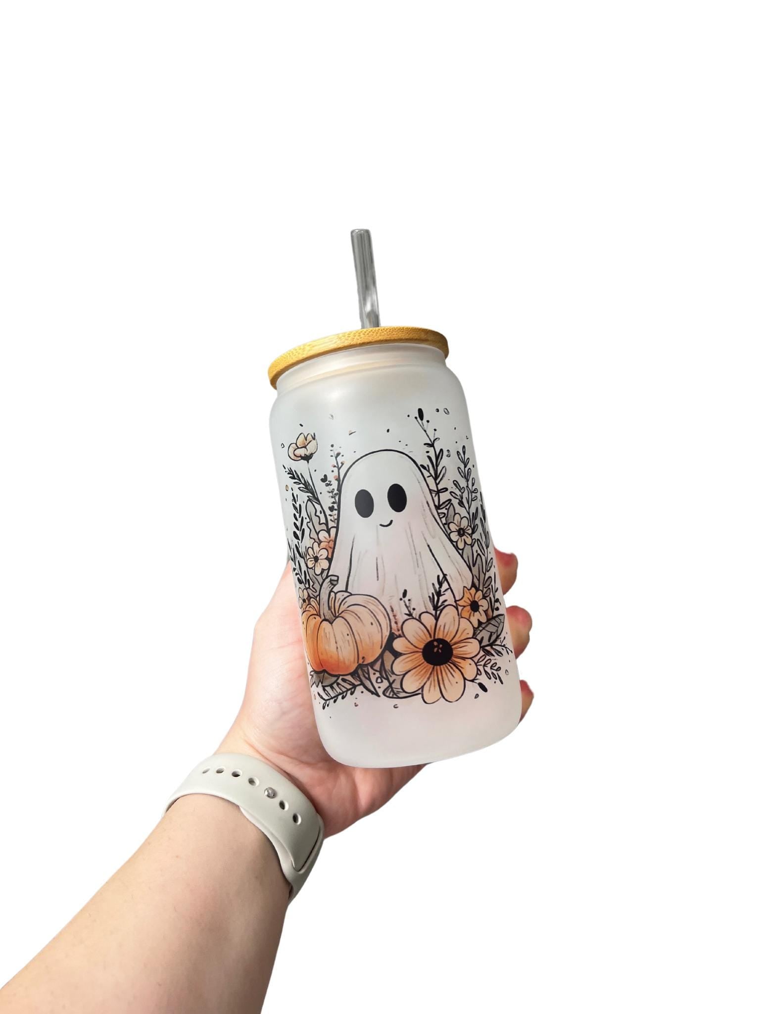 Floral Ghostie 16oz Glass, Cute Ghost custom glass, Spooky custom glass