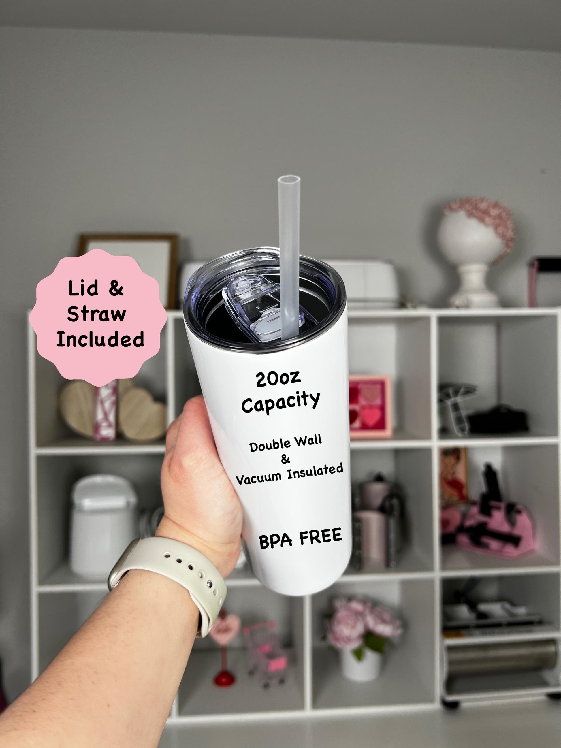 Hand pressed sublimated 20oz tumbler that keeps your drinks cold for up to 11 hours and keeps your drinks hot for up to 5 hours!